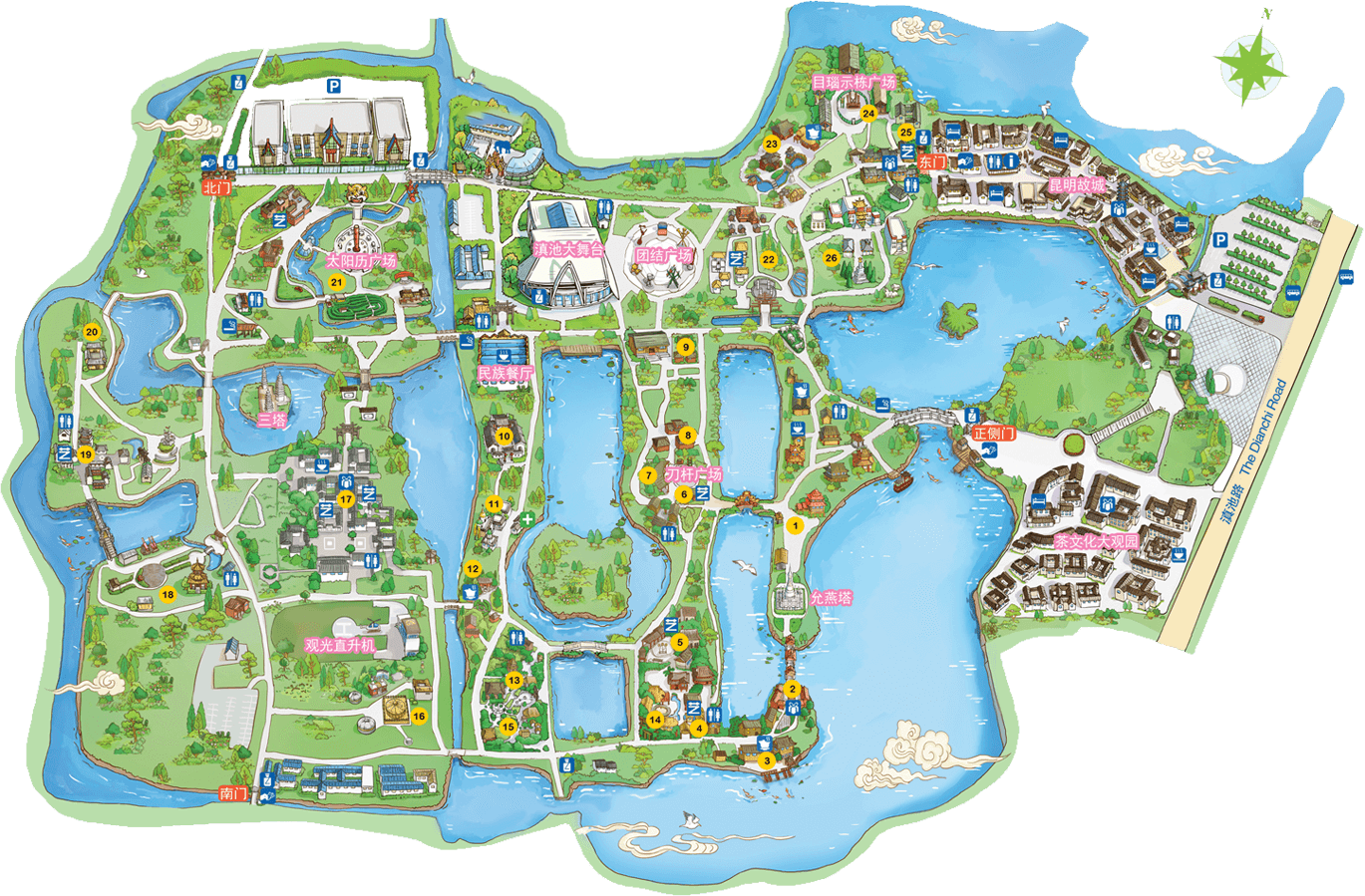 佤族人口約36萬,主要聚居在云南省瀾滄江南段以西的阿佤山區。佤族寨位于“翠漪洲”東南角。寨內分布有茅草頂的干欄式建筑群、牛頭廣場、神靈廣場、司崗里石雕以及糧倉等。牛頭廣場是佤族古老的剽?;顒訄鏊?,場正中的牛角為佤族的寨樁,廣場前的兩個石人分別為佤族的男性和女性祖先。神靈廣場表現了佤族萬物有靈、靈魂不死的自然崇拜觀念。場中兩個石人雕像分別為佤族最崇拜的“木依吉”和“阿依娥”。佤族木鼓舞節拍鮮明強烈,...